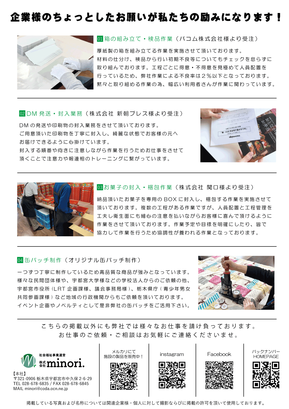 ● | 事業所の中を実際に見て頂き、お仕事の様子などをご説明させて頂きます。ご家族や他の支援員さん、ハローワークの担当の方などの同席も歓迎です。 |